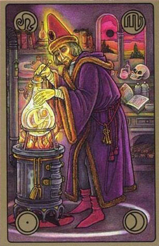 В колоде Симболон карта изображает фигуру алхимика за работой с различными элементами, что символизирует мастерство, опыт и внутреннее преображение. Описание карты подчеркивает, что для успешного преобразования важно действовать осознанно и целенаправленно, не бояться экспериментировать и учиться на опыте, даже если в окружении нет поддержки.