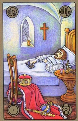 В колоде Симболон эта карта изображает правителя, утратившего силу, но сохранившего достоинство. Его образ символизирует временную слабость, урок смирения и важность поиска баланса. Описание карты дает нам понять, что слабость лидера связана не только с физическим недугом, но и с метафорическим «бессилием», которое может проявляться в работе, отношениях или внутреннем состоянии.