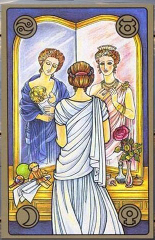 Астрологическое соответствие карты – планета Луна или Венера в знаке зодиака Рак или Телец. Телец символизирует стабильность, чувственность, телесность и стремление к удовольствию, а Венера управляет любовью, отношениями, самооценкой и эстетикой. Когда эти энергии искажаются или подавляются, возникает двойственность, где человек внешне проявляет одни чувства, а внутренне испытывает другие.