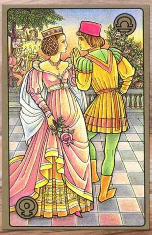 Описание карты Пара в колоде Симболон показывает двух людей, стоящих рядом друг с другом, часто соединенных взглядом или жестом. Между ними – теплая, светлая атмосфера, символизирующая единство, принятие и связь. На заднем плане может быть природный ландшафт – зеленые поля, цветы или фрукты – символ изобилия и плодородия, отражающий энергию планеты Меркурий и знака Девы.