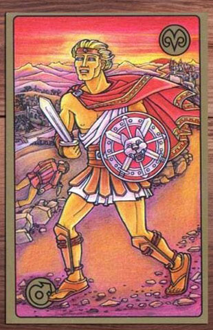 В системе астрологического оракула Симболон каждая карта связана с определенной планетой и зодиакальным знаком. Для карты Воин это – планета Марс в знаке зодиака Овен. Такое астрологическое соответствие подчеркивает качества агрессии, силы воли, напора и первичного импульса. Это энергия первооткрывателя и борца, который идет вперед, не оглядываясь на последствия.