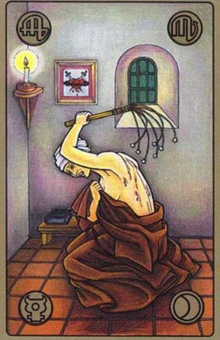 Символизм карты фокусируется на добровольной жертве. Цепи и боль символизируют убеждение, что только через страдание можно заслужить любовь, прощение или успех. Самобичевание – это крайняя форма самокритики. Этот архетип напоминает, что настоящая святость не требует боли.