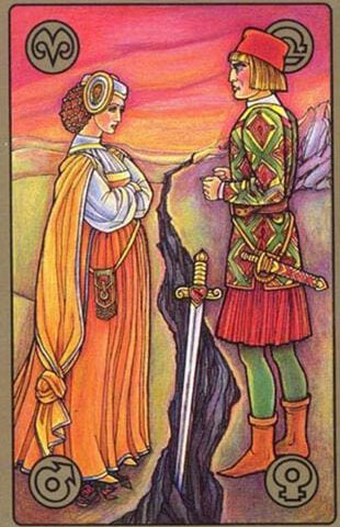 Астрологическое соответствие карты «Ссора» связывает динамику конфликта с энергиями Овна и Весов, управляемых Марсом и Венерой. В то время как Овен подчеркивает напор, активность и стремление к лидерству, Весы напоминают о необходимости баланса и гармонии в отношениях. Планета Венера усиливает важность внешних проявлений и эмоциональной сферы. А вот если бы в сочетании присутствовал знак зодиака Телец, то он бы добавил стабильность и настойчивость, подчеркивая, что даже в момент «ссоры» важно сохранять фундаментальные ценности и не разрушать то, что дорого. В целом, в Симболон карта в этом контексте символизирует моменты напряжения, которые могут стать точкой роста, если правильно направлять энергию. Совет оракула здесь заключается в том, чтобы осознанно управлять конфликтами, не позволяя эмоциям полностью завладеть ситуацией и не придавать значения тем нюансам, которые не стоят внимания.